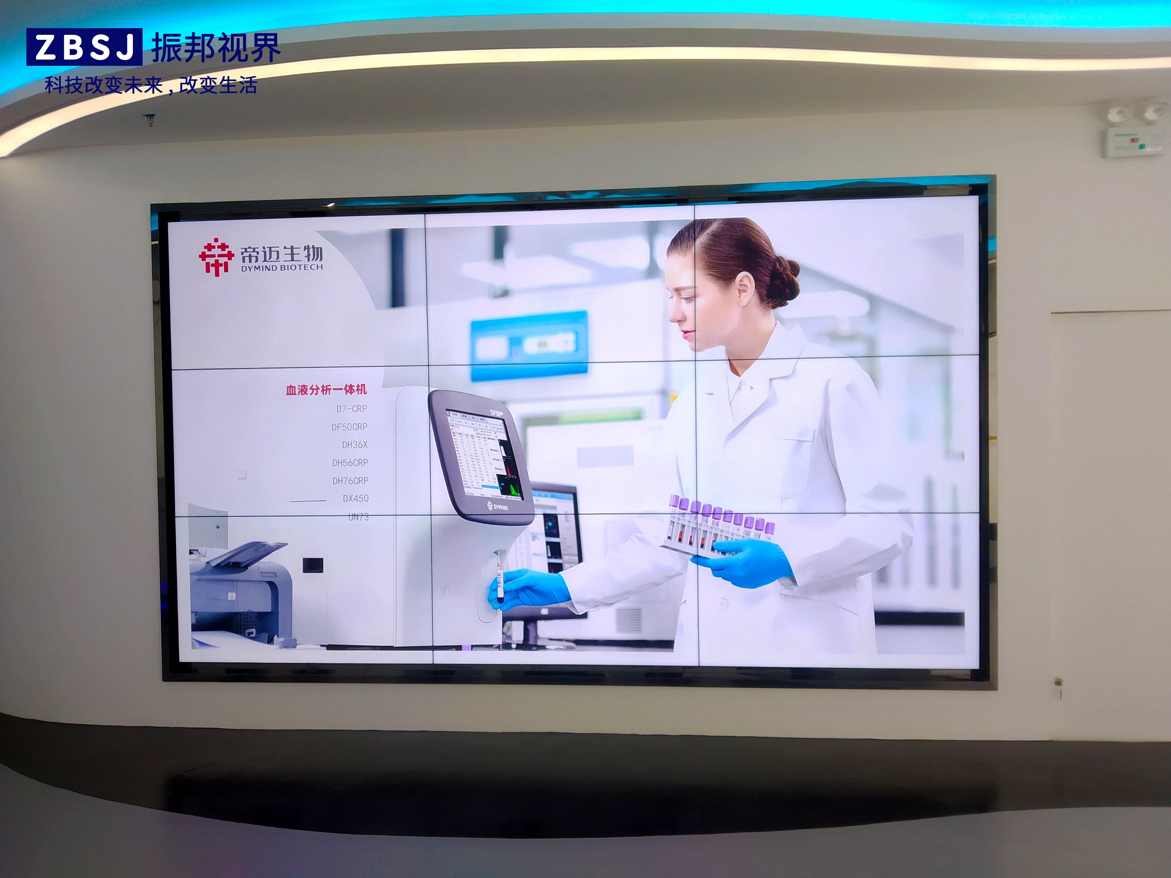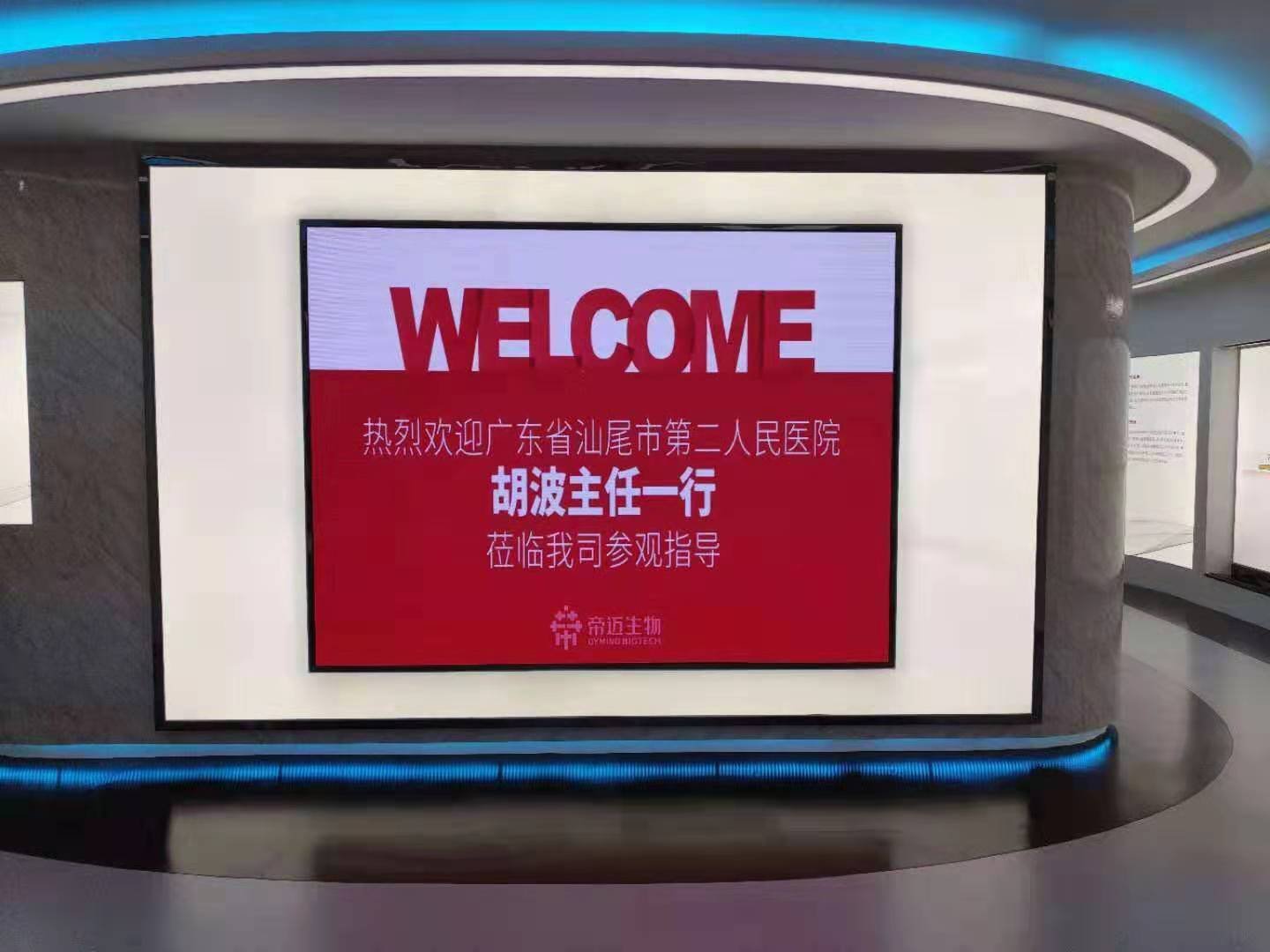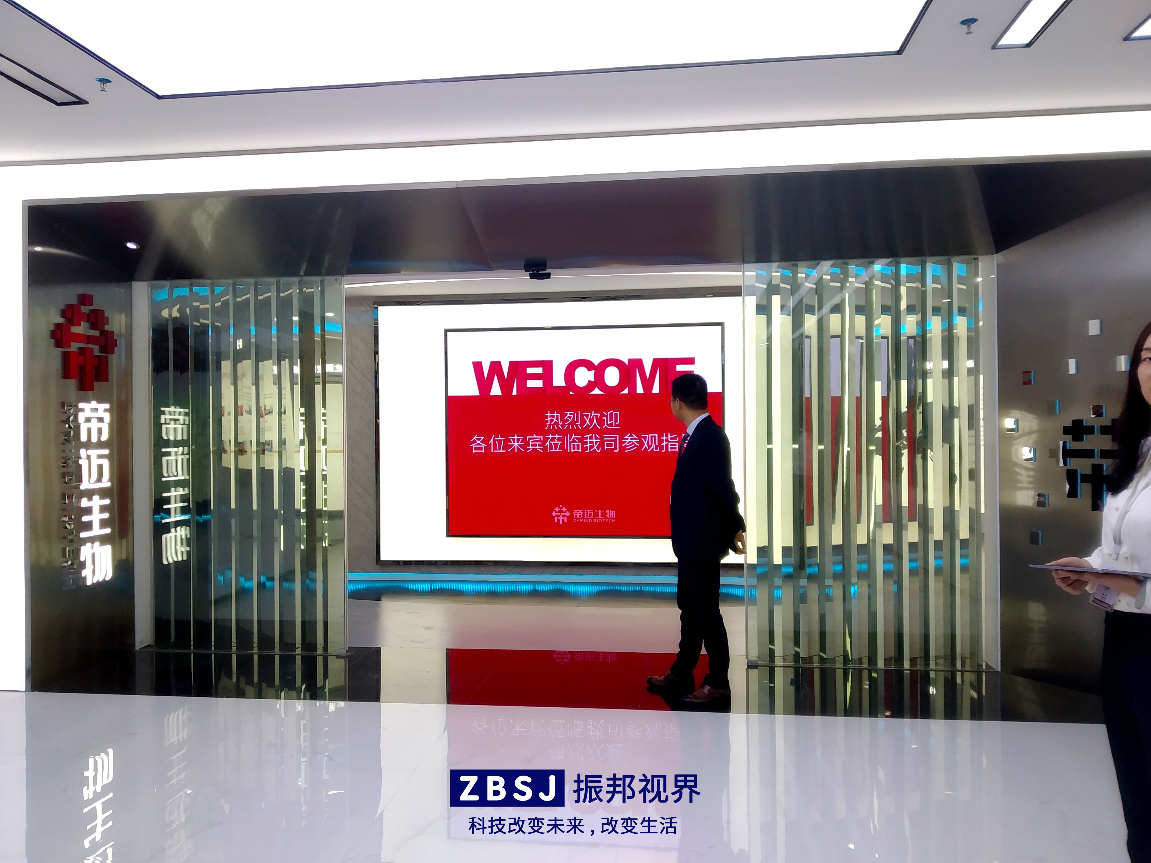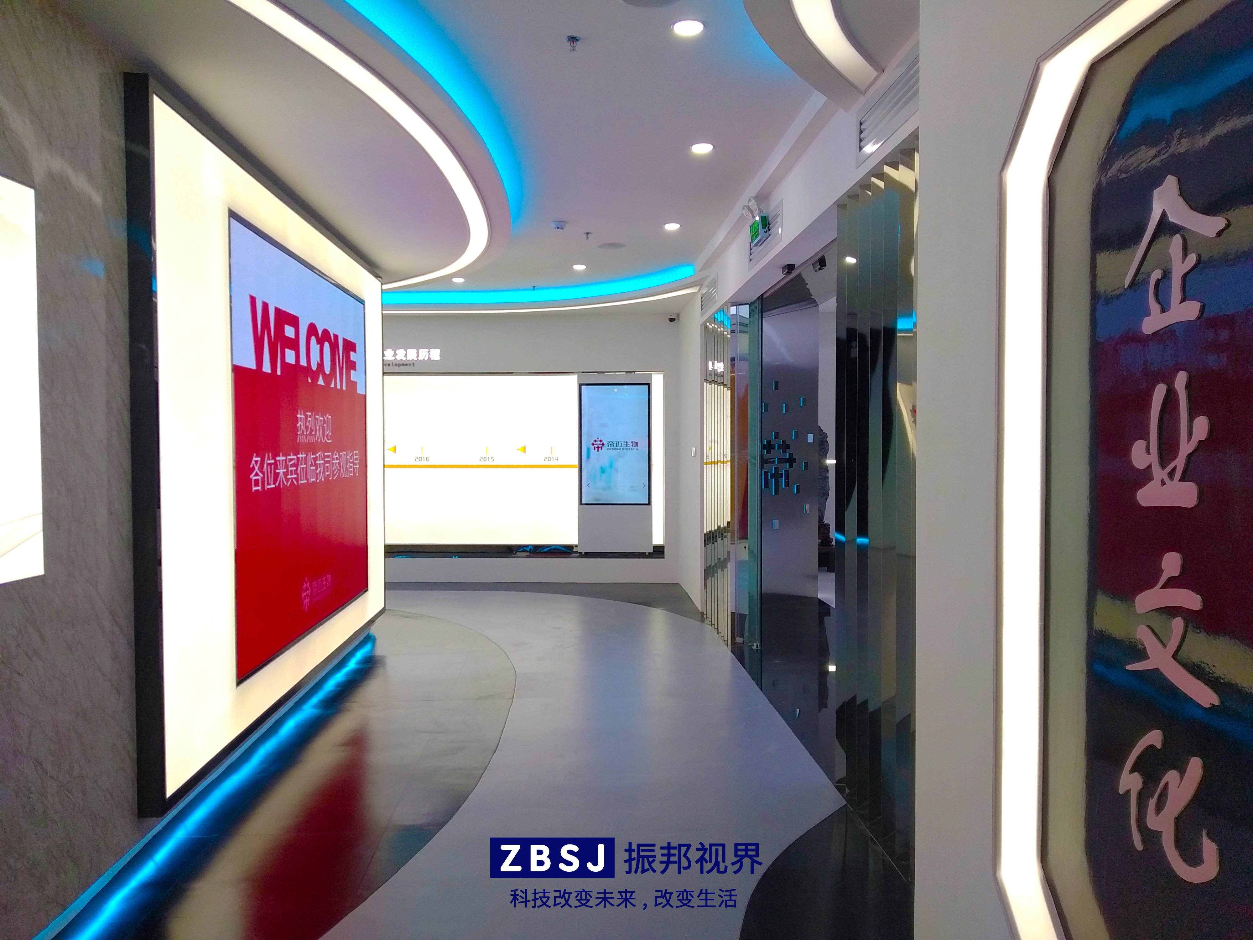 進(jìn)入展廳大門,是一個(gè)LED大屏幕,上面顯示著帝邁生物企業(yè)展廳的參觀迎賓語。