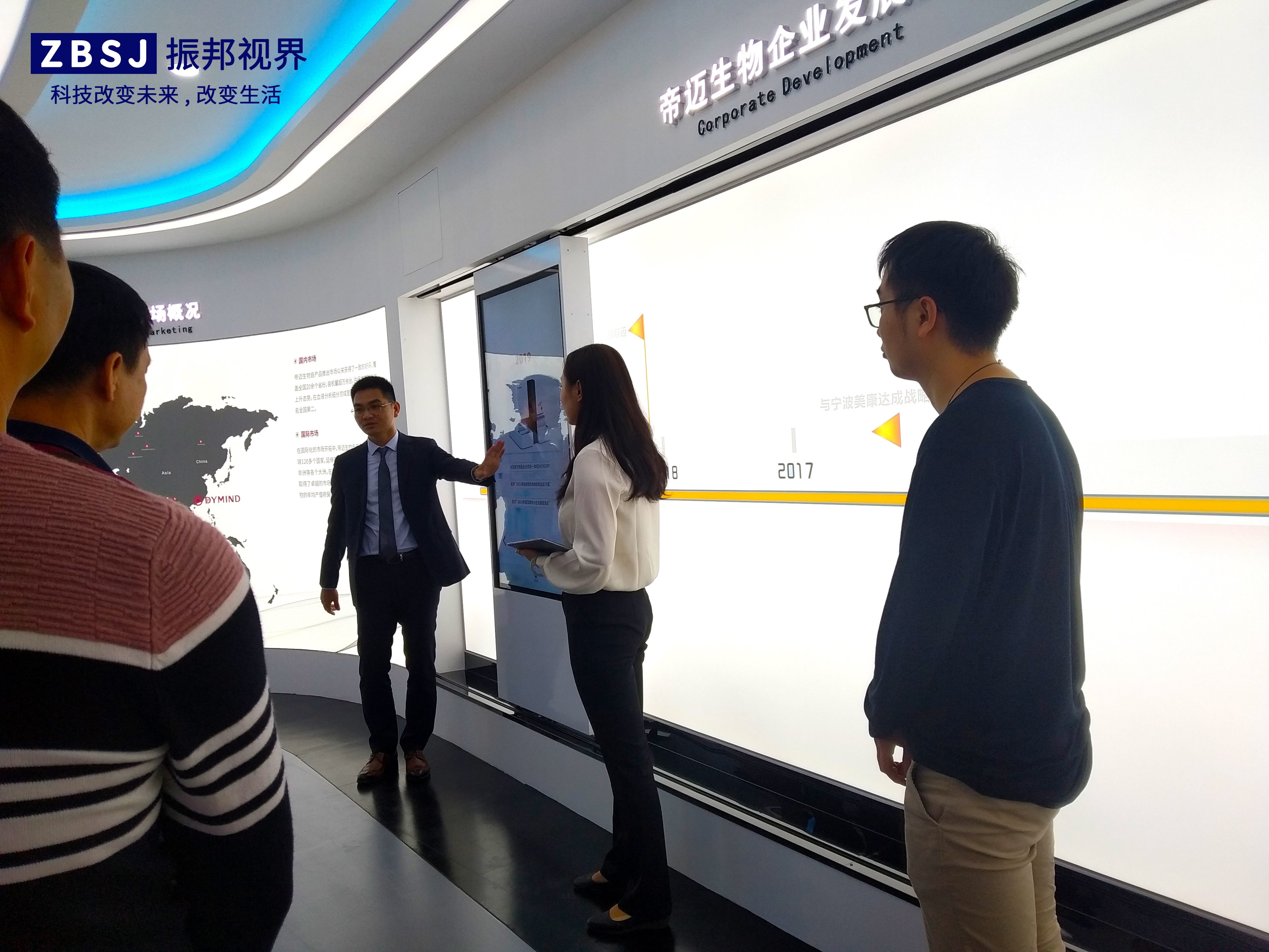 進(jìn)門右轉(zhuǎn)是電動(dòng)滑軌屏、通過移動(dòng)的屏幕展示深圳市帝邁生物技術(shù)有限公司從2013到2019的企業(yè)發(fā)展的歷程。點(diǎn)擊屏幕,可彈出圖文和視頻介紹。