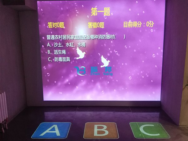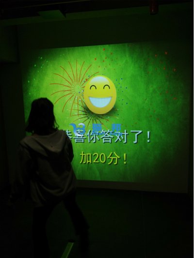 利用互動投影技術(shù)和多屏分割顯示技術(shù),通過捕捉設(shè)備對體驗(yàn)者踩選答案的位置和動作進(jìn)行捕捉拍攝,采集后由軟件系統(tǒng)分析,從而時實(shí)產(chǎn)生對錯判斷及題面更換,十分富有趣味性。