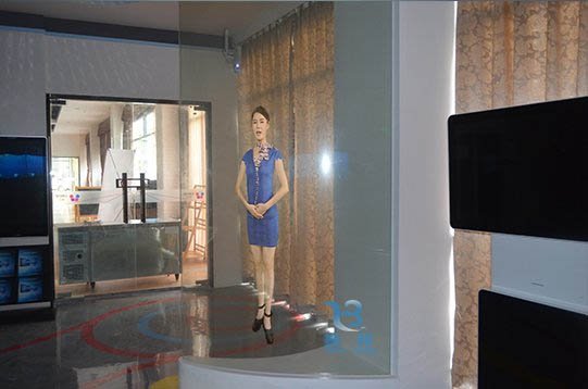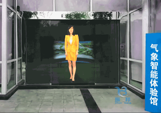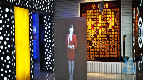 運用三維動畫、人機互動紅外感應處理、大屏幕顯示、投影機背投等技術來實現(xiàn),觀眾會看到一個豎立的大屏幕(大屏幕可以用等離子電視機、背投投影幕、投影玻璃、通電玻璃等)上有一位講解員的靜止影像(或是靜態(tài)底圖),當觀眾走到屏幕前時,屏幕中即出現(xiàn)動態(tài)講解員形象,開始為觀眾介紹。