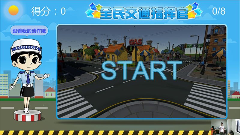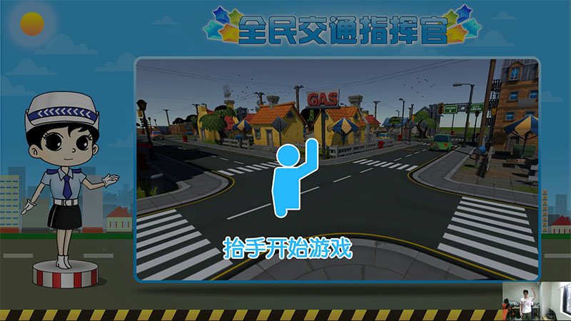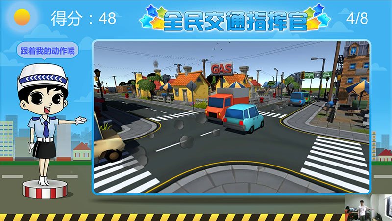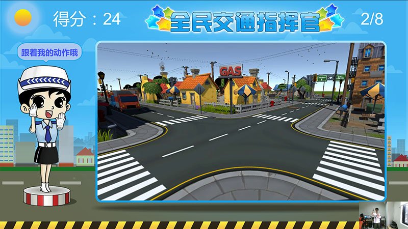 玩家通過跟著左邊的小交警擺出指定的安全交通手勢,如果擺出的手勢正確,則進入下一個姿勢,反之則會出現(xiàn)交通擁擠混亂?梢杂脕砦∨笥亚皝眢w驗,讓他們學會交通安全的同時,也吸引了家長前來。