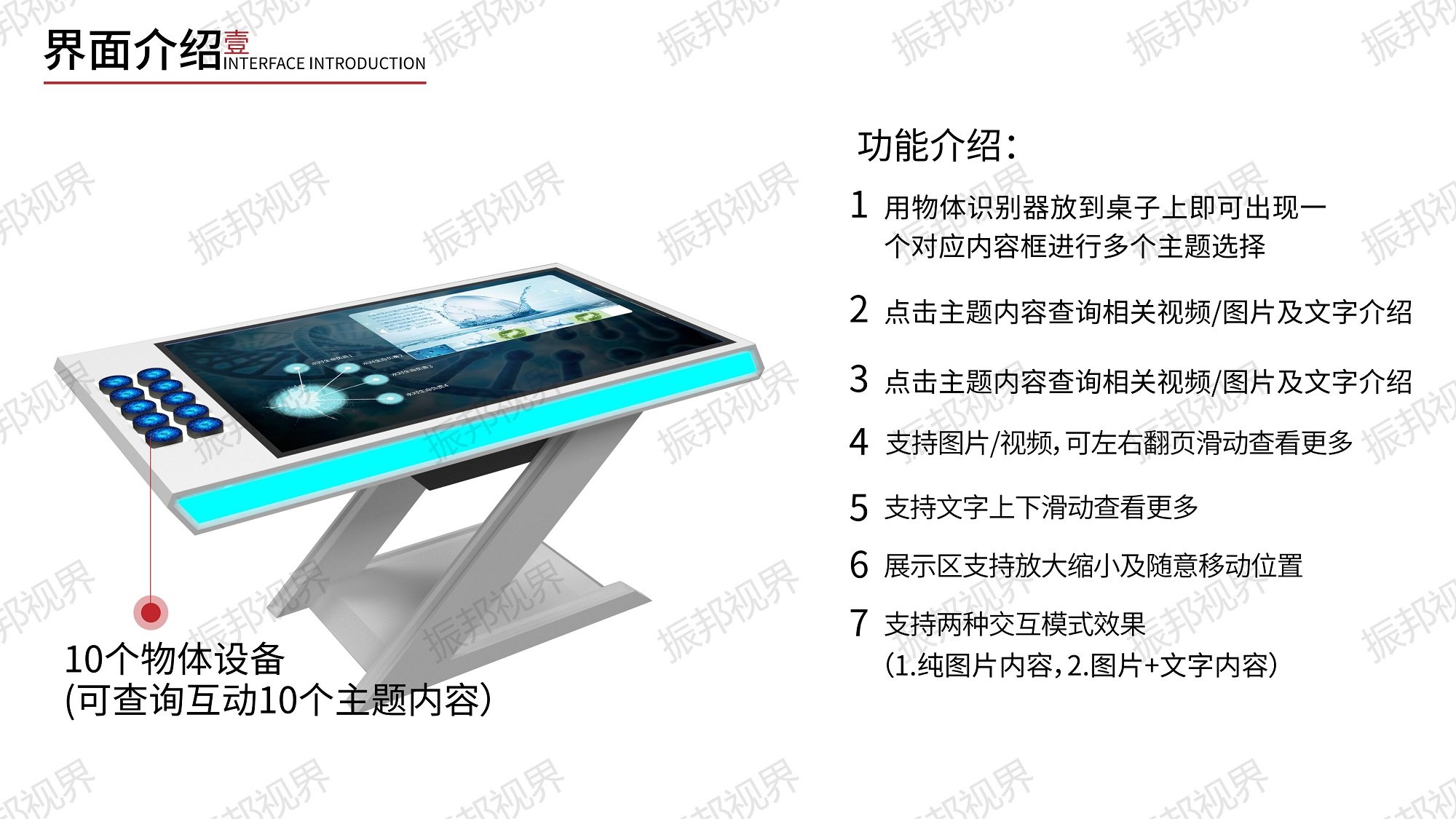 AR物體識別桌也叫“AR互動桌”,由交互系統(tǒng)、觸摸屏、物體識別器三要素組成的展廳內(nèi)容展示設(shè)備,并且都能夠支持來自屏幕上多個點進(jìn)行計算機(jī)的人機(jī)交互操作。AI識別桌在脫離了鍵盤、鼠標(biāo)的傳統(tǒng)單點操作方式的基礎(chǔ)上,還能允許多個操作者在同一顯示界面上進(jìn)行多點交互操作。(下圖是識別桌的詳情頁介紹)