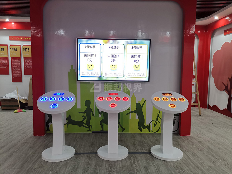 搶答款-互動(dòng)問答系統(tǒng)由搶答器、顯示設(shè)備及搶答互動(dòng)系統(tǒng)構(gòu)成,讓體驗(yàn)者通過按鍵搶答答題來學(xué)習(xí)了解相關(guān)知識。
