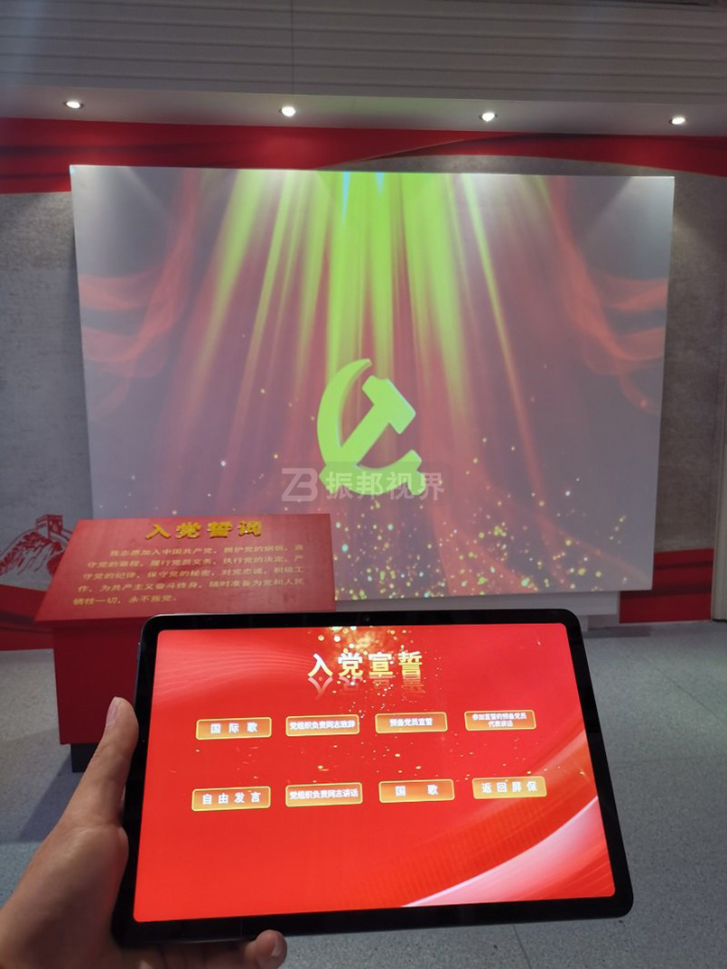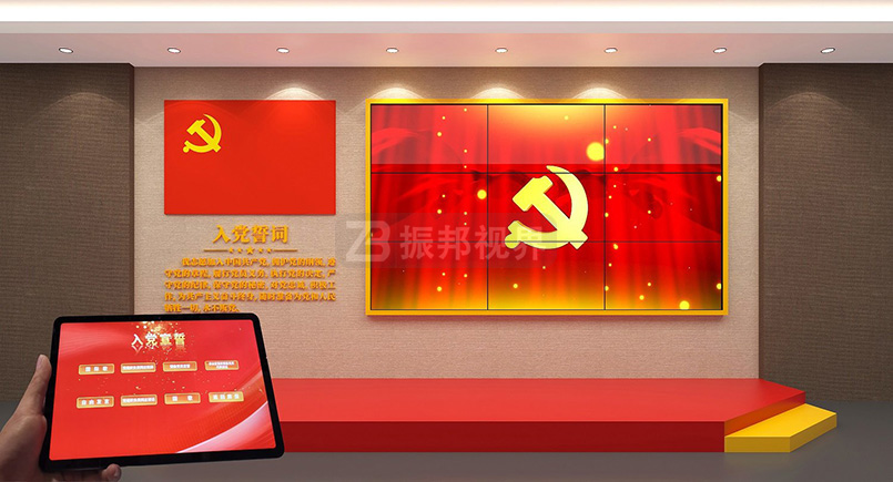 互動(dòng)宣誓墻系統(tǒng)是由平板播放控制系統(tǒng)和顯示幕墻構(gòu)成的,該系統(tǒng)是按照標(biāo)準(zhǔn)的入黨宣誓流程定制的,領(lǐng)誓人通過(guò)平板電腦無(wú)線控制對(duì)應(yīng)流程的圖片或視頻播放,來(lái)輔助入黨宣誓儀式。