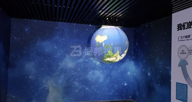 球幕系統(tǒng)主要由無縫內(nèi)投球幕、投影設(shè)備、專用結(jié)構(gòu)及控制系統(tǒng)構(gòu)成,顯示呈球形畫面,可以帶觸控功能,配合不同的顯示幕墻做擴(kuò)展屏,作地球區(qū)位展示或分支機(jī)構(gòu)展示。