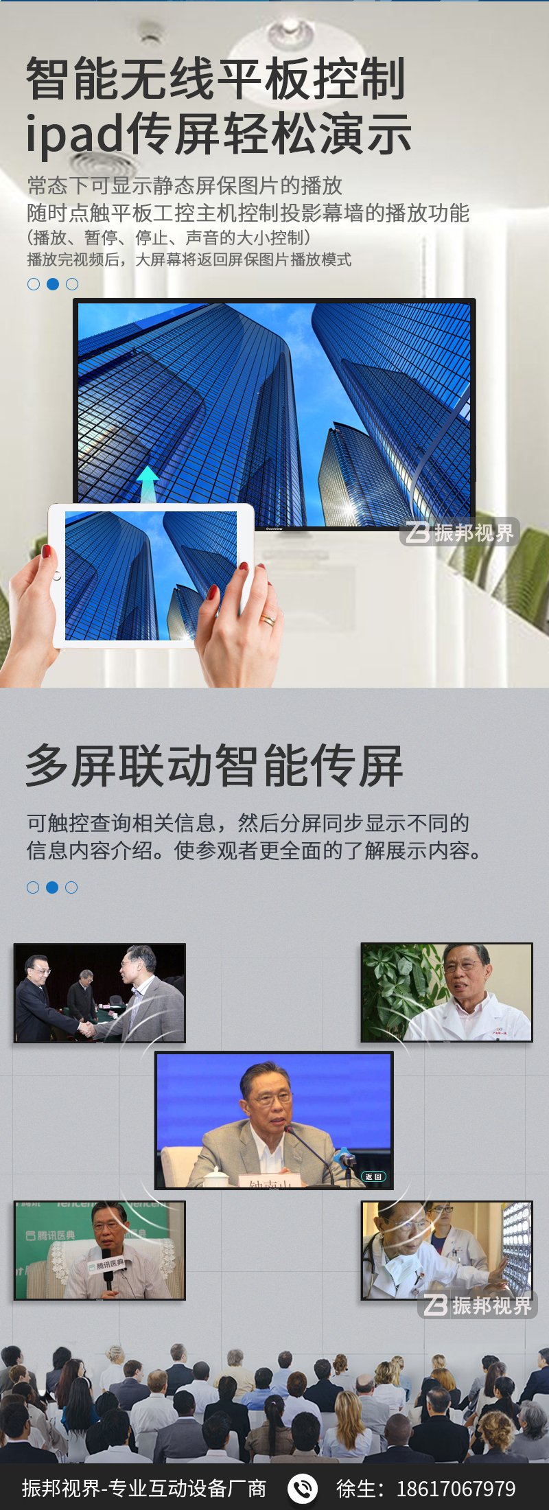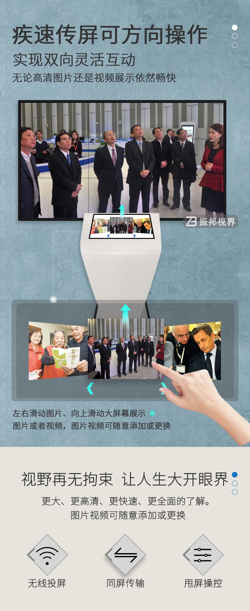 產(chǎn)品簡(jiǎn)介:多屏互動(dòng)是振邦視界推出的一款液晶顯示創(chuàng)意互動(dòng)產(chǎn)品。通過(guò)觸控主屏聯(lián)動(dòng)控制其它屏幕,并且分屏傳輸不同的顯示內(nèi)容,為參觀者展現(xiàn)更為豐富的內(nèi)容,帶來(lái)全新的互動(dòng)展現(xiàn)形式。
