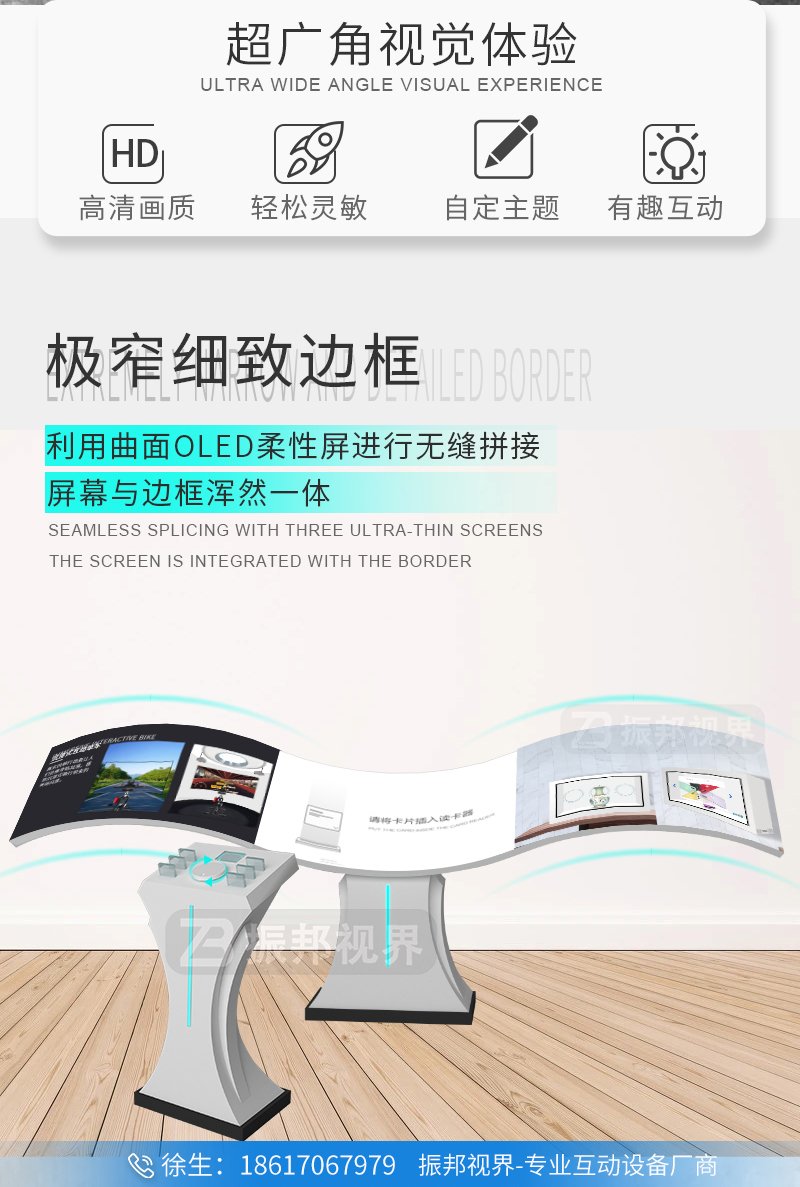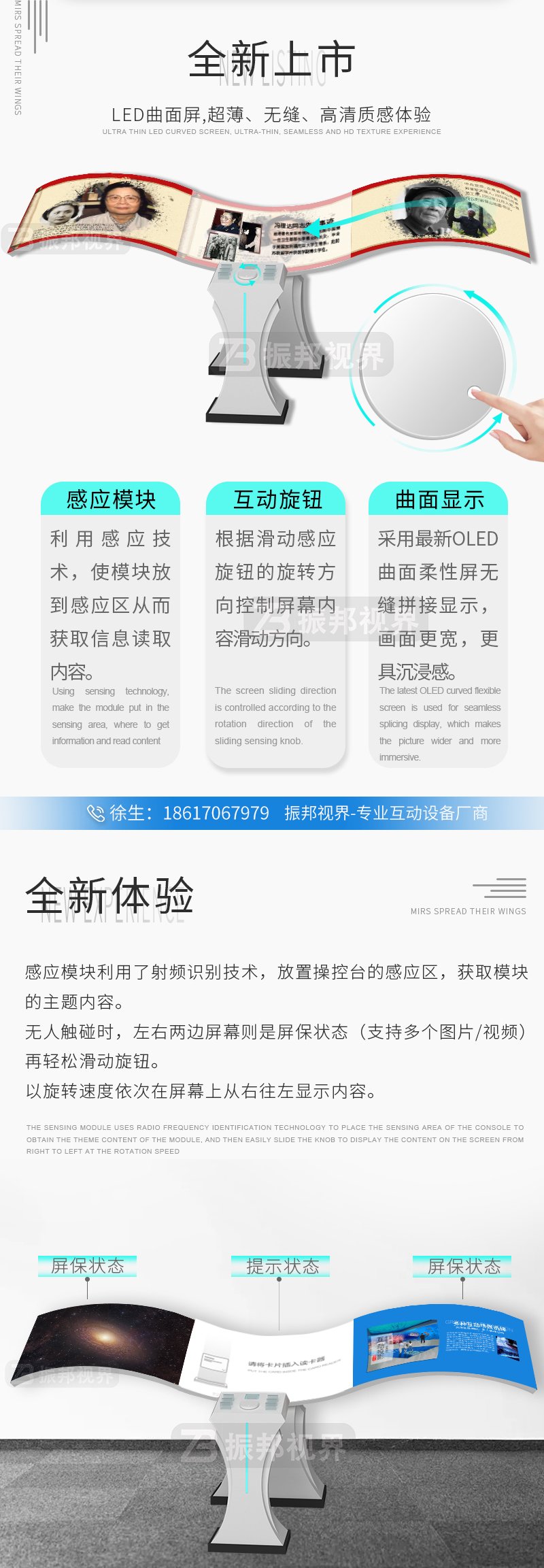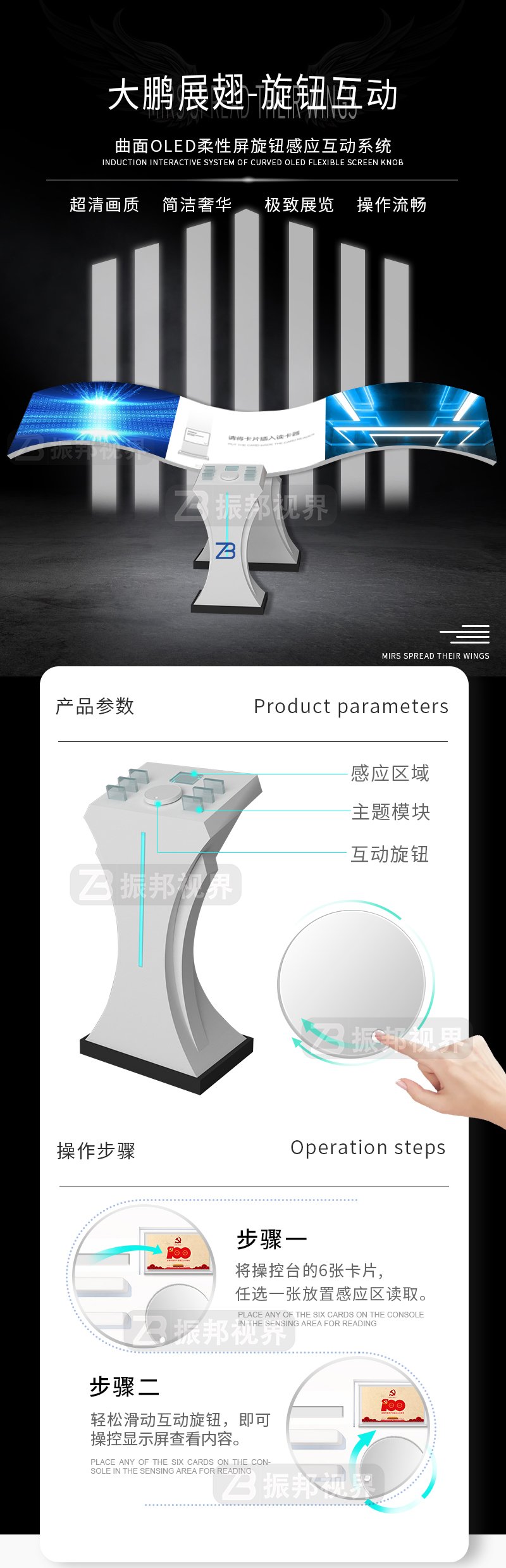 深圳振邦視界最新研發(fā)的大鵬展翅旋鈕互動(dòng)產(chǎn)品由OLED曲面柔性屏+旋鈕感應(yīng)系統(tǒng)組成?商砑佣鄠(gè)感應(yīng)模塊內(nèi)容,無(wú)縫銜接的超精細(xì)工藝,讓展覽展示交互體驗(yàn)更加完美!