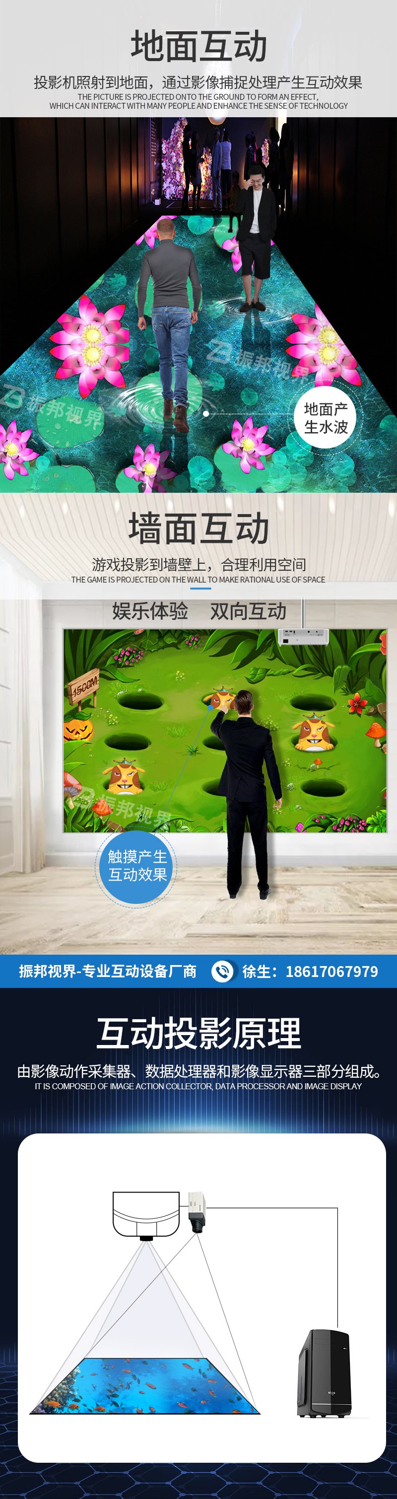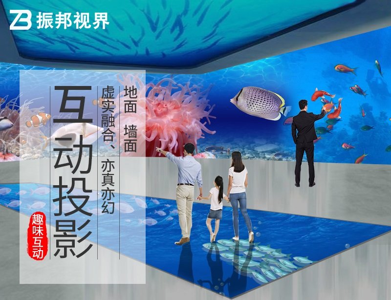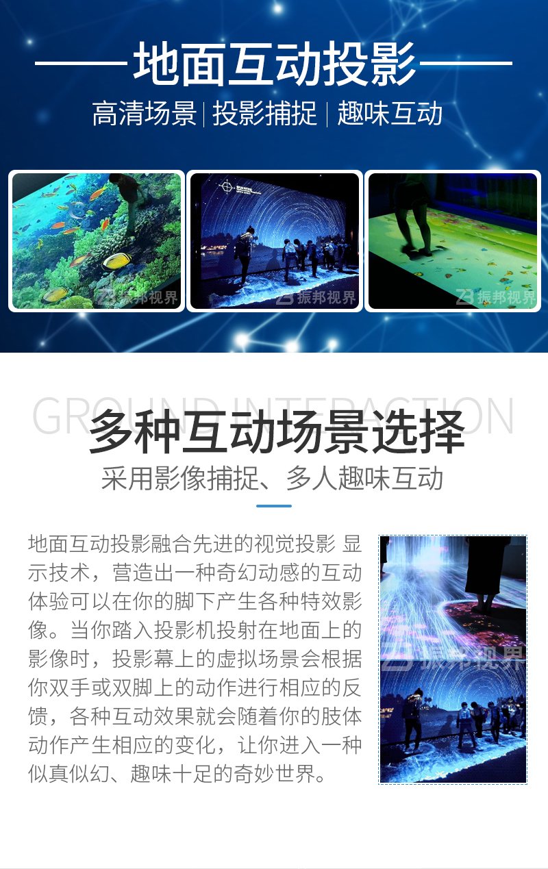互動投影是振邦視界新推出的一款高科技互動產(chǎn)品。通過投影與影像捕捉技術(shù),使任意一塊平淡無奇的地板區(qū)域變成炫酷高科技、并實時交互的神奇之地。地面互動可采用真實場景融合,并支持多點互動、使多人同時參與游戲,趣味無窮。