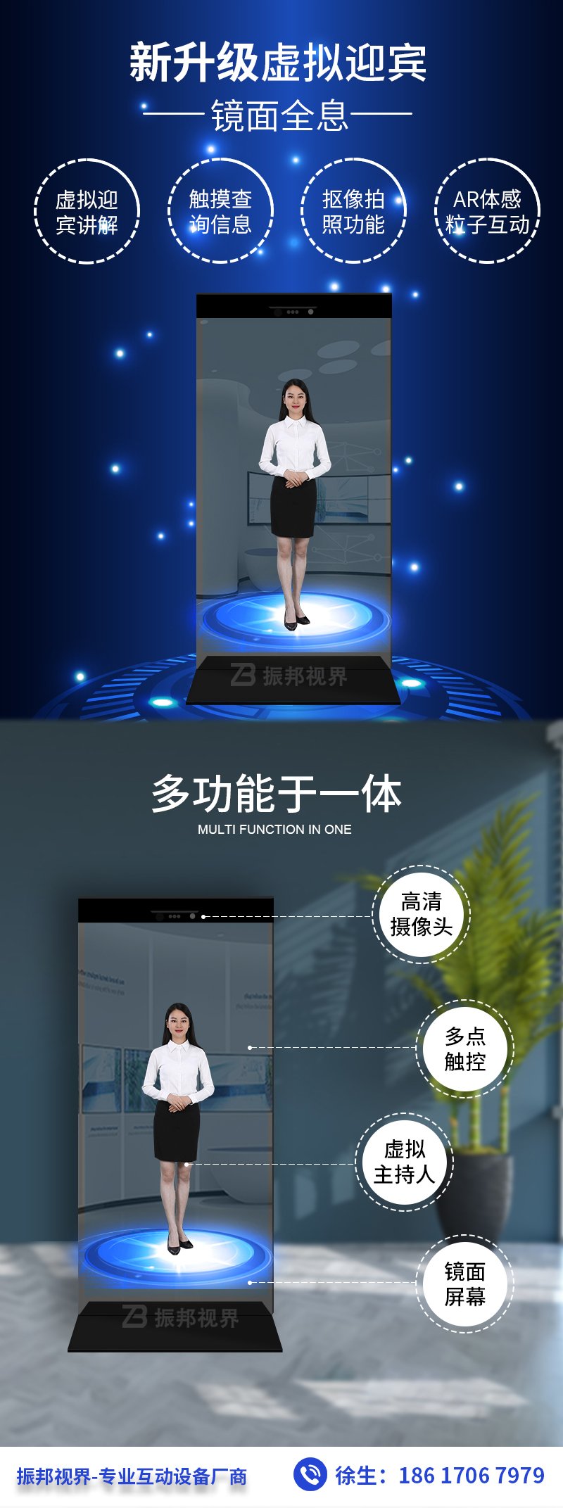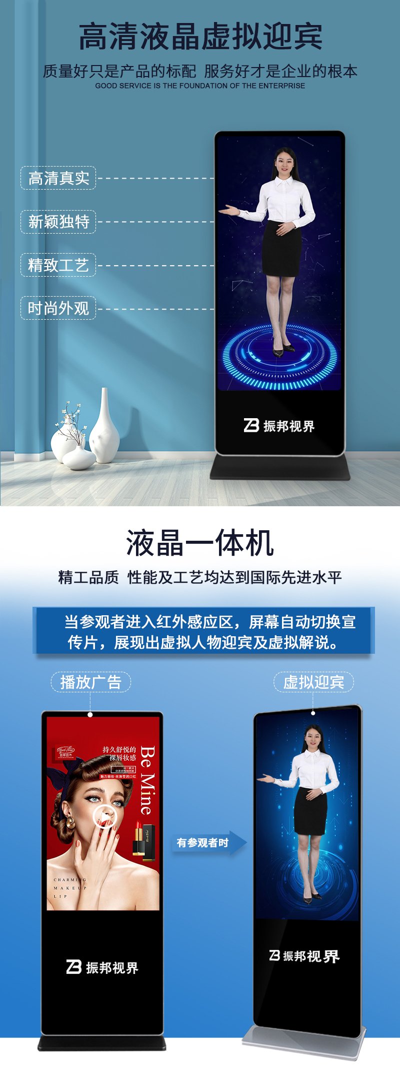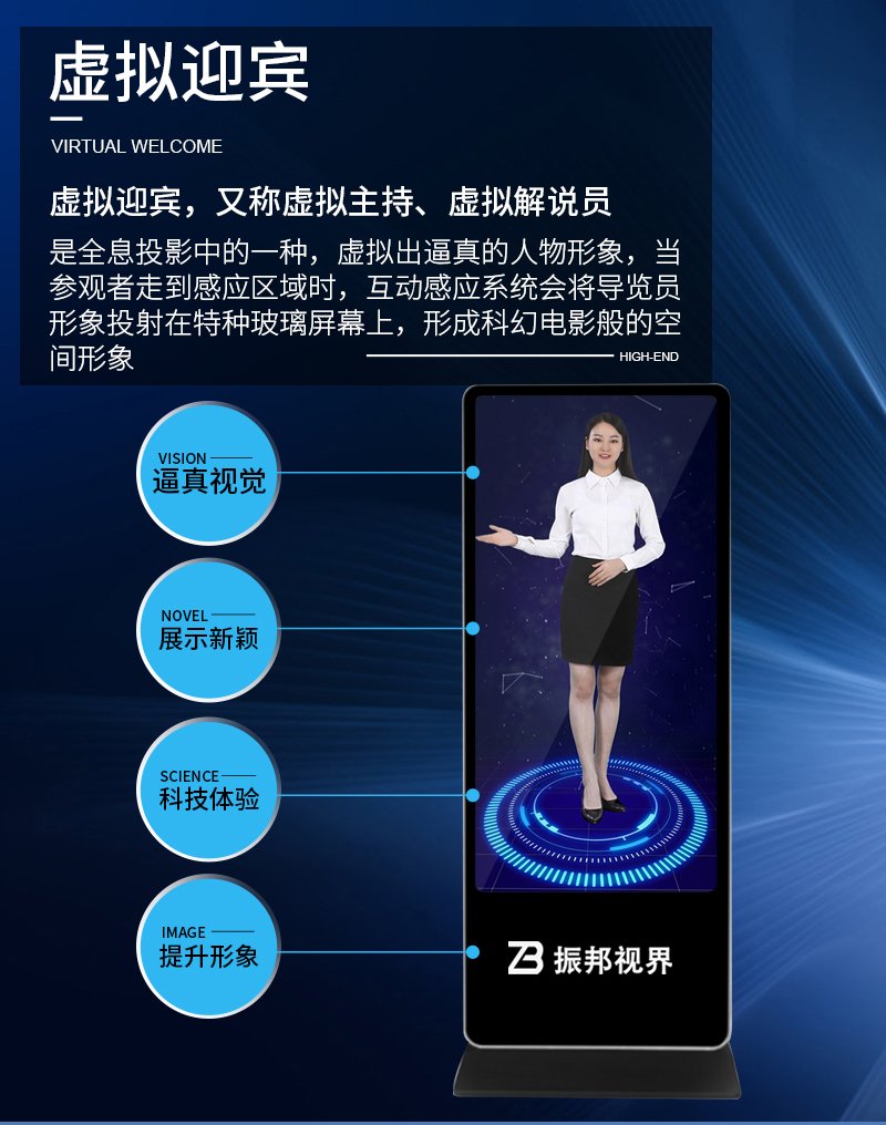 產(chǎn)品簡介:虛擬迎賓是振邦視界新推出的一種取代傳統(tǒng)真人講解、富有高科技感的產(chǎn)品,當(dāng)參觀者進(jìn)入紅外感應(yīng)區(qū),屏幕自動切換宣傳片,展現(xiàn)出虛擬人物迎賓及虛擬解說。