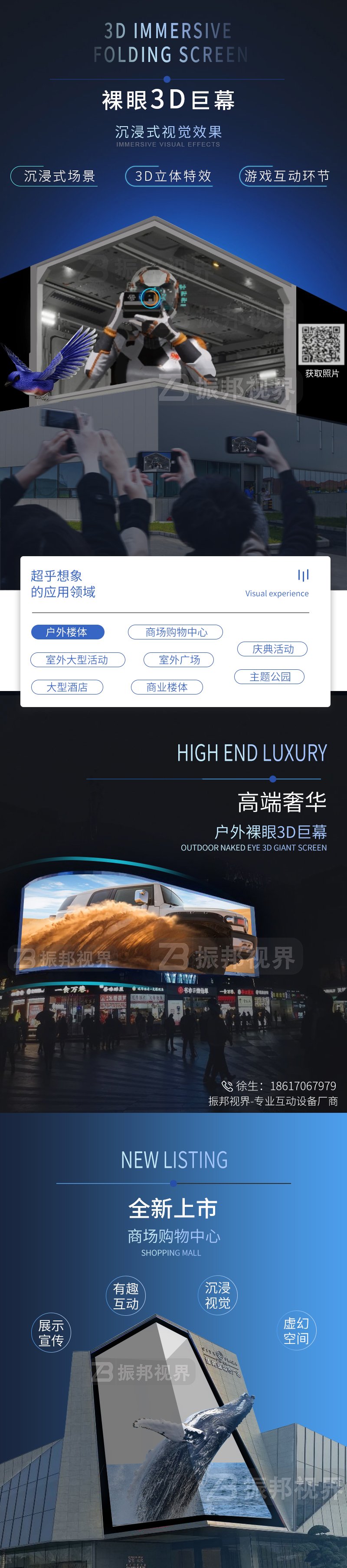 產(chǎn)品簡介:深圳振邦視界最新推出了裸眼3D互動巨幕,該展項打破了常規(guī)的展覽形式,不僅能帶來震撼的沉浸感,圍觀的群眾站在巨幕下面,還可和其進(jìn)行互動拍照并傳至影幕上,非常有趣。
