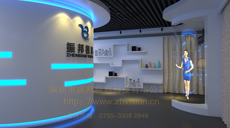 虛擬迎賓,又稱虛擬解說員、虛擬主持、虛擬播音員,是全息投影中的一種,虛擬出逼真的人物形象,當(dāng)參觀者走到感應(yīng)區(qū)域時(shí),互動(dòng)感應(yīng)系統(tǒng)會(huì)將導(dǎo)覽員形象投射在特種玻璃屏幕上,形成科幻電影般的空間形象,歡迎來賓光臨,為參觀者介紹展館的主題分布及特色展區(qū)。
